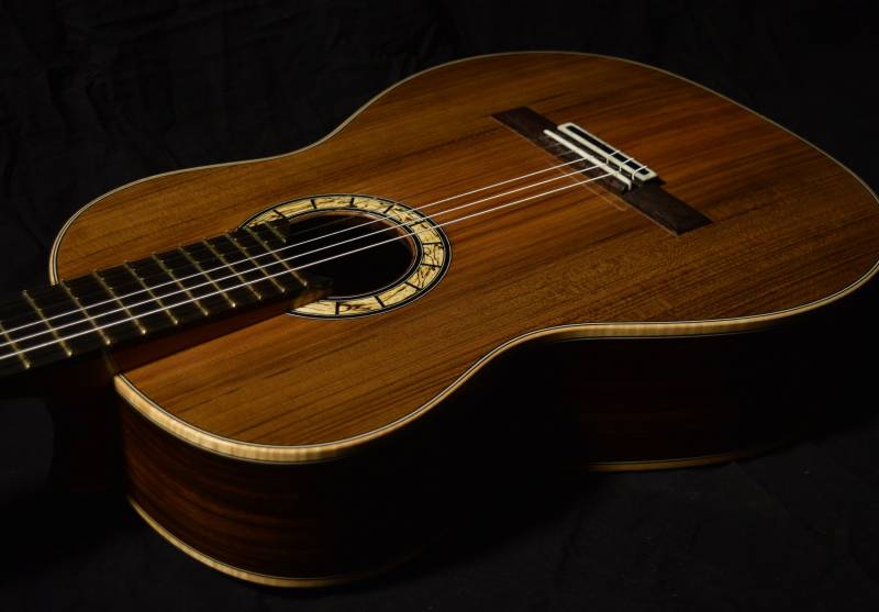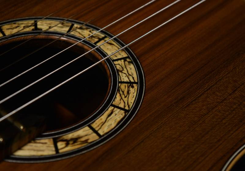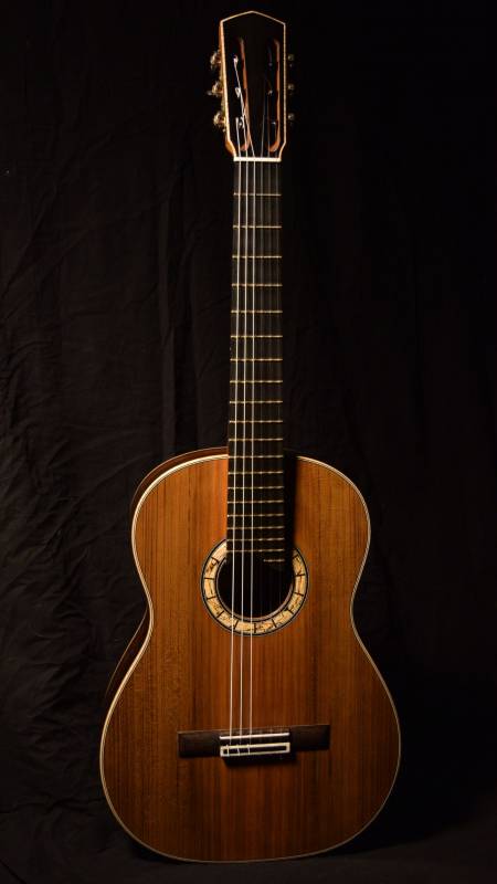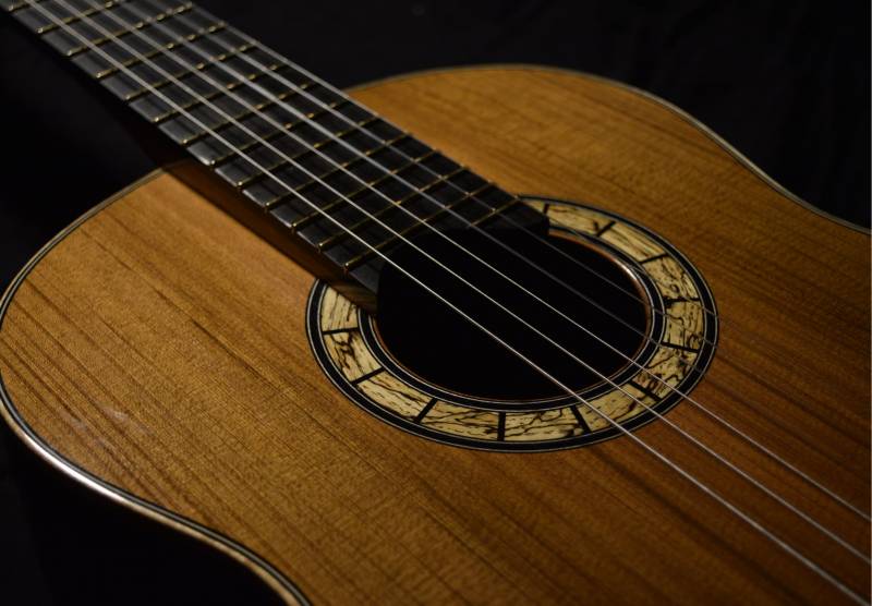 This is special project to create another bound Spanish heel. It is a traditional guitar with a very dark cedar top and a pleasantly constrasting rosette made from spalted chestut oak. The body is slightly longer than my standard guitar plantilla yet it is also more narrow. It's a very elegant guitar with a powerful, focused treble response and basses that growl in that folksy way that only fan braced guitars seem to possess. The bracing is 6 fans with a diagonal